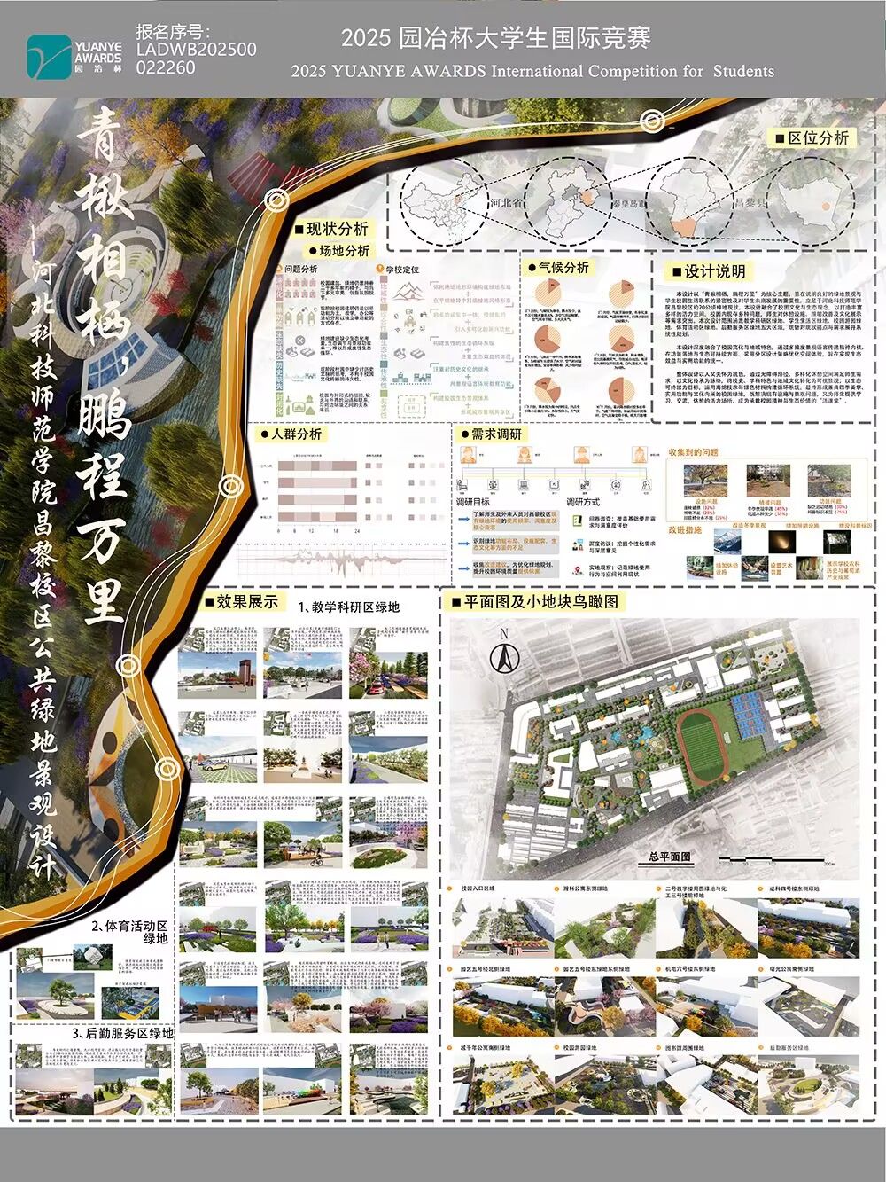 本设计以“青楸相栖,鹏程万里”为核心主题,意在说明良好的绿地景观与学生校园生活联系的紧密性及对学生未来发展的重要性。立足于河北科技师范学院昌黎校区约20公顷绿地现状,本设计融 ...